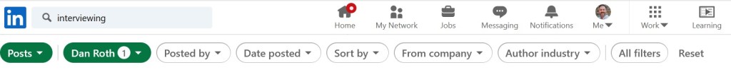 Following LinkedIn members who you think will provide excellent job-search content is better than the aforementioned methods. Start with one of your favorites members by typing in Search the topic of interest. Again, I’m choosing “interviewing.” Select Post, then From member, and then type the member’s name.