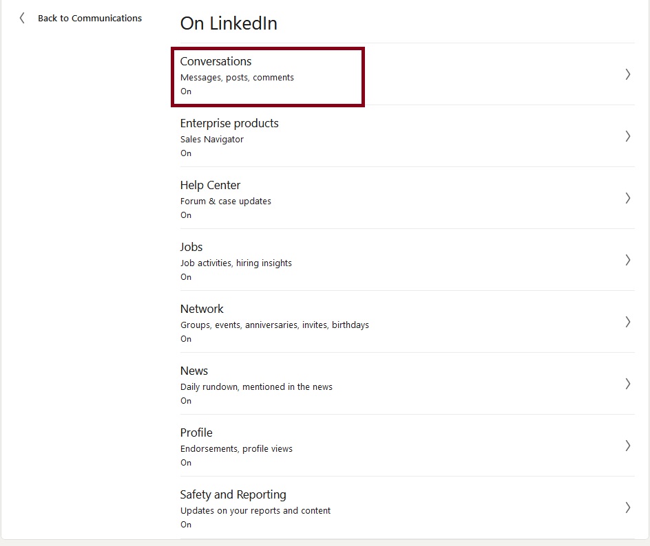 Many people don’t realize that they can improve their notifications by selecting View Settings to the left of their Notifications‘ view. You’ll be brought to the page you see below. Click the arrow to the right of Conversations for messages, posts, comments, etc.