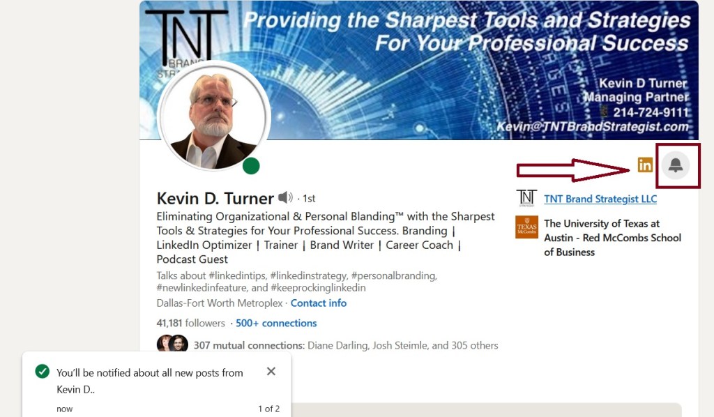Another way to follow LinkedIn members is by “ringing” the bell next to their name. Whenever they produce content, it will show in your feed. The problem with using this method to find content is poor timing. In other words, if you’re not looking at your feed that hour or that day, you’ll miss the person’s content.